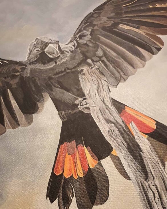 The use of Titanium white has it’s place, but it should not be solely relied upon to provide lightness and contrast in black feathers. As the Australian Ghost Gum provides warmth with lightness, Titanium white is more useful in providing the brilliance of a white light. ( For example: to keep the light shining through a red or orange feather clean and bright). It is also useful for creating a pure grey when added to Lamp Black. I preferred to use Mars Black in this painting because it has more warmth to it.